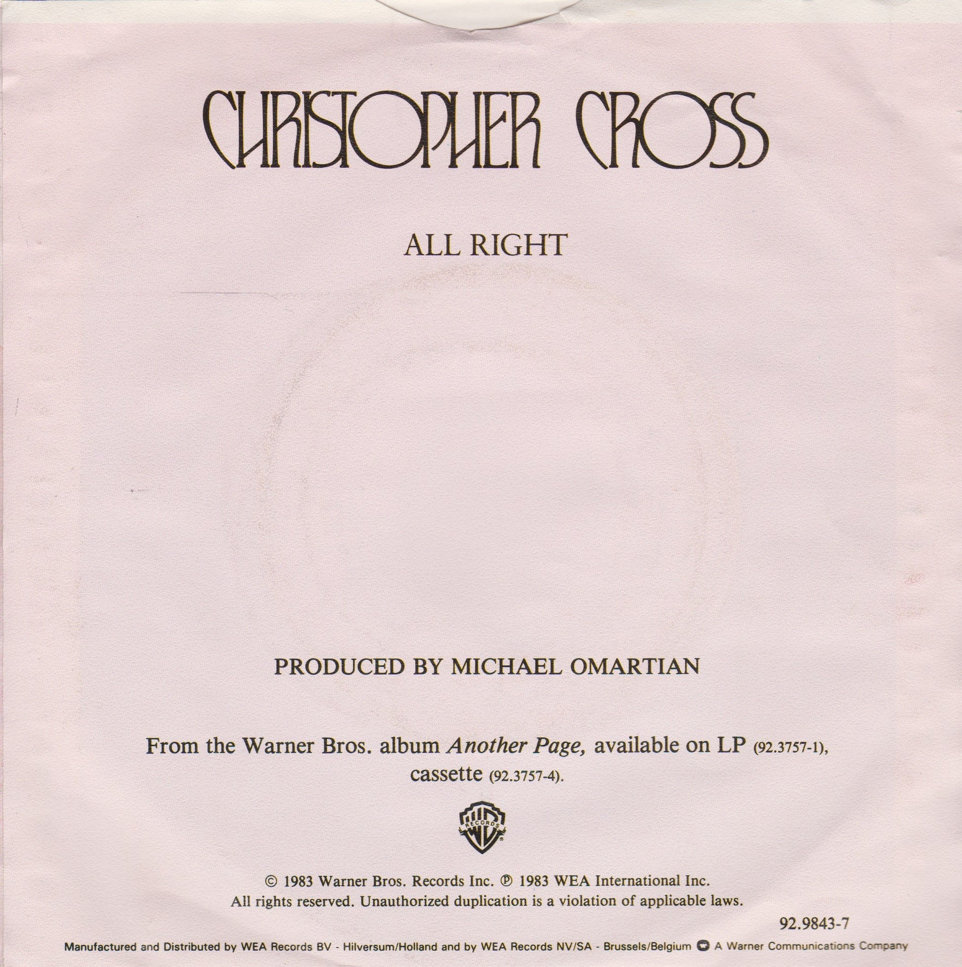 Christopher Cross – All Right (WB 1983) 7" vinyl P/S single VG/VG Dutch import jukebox