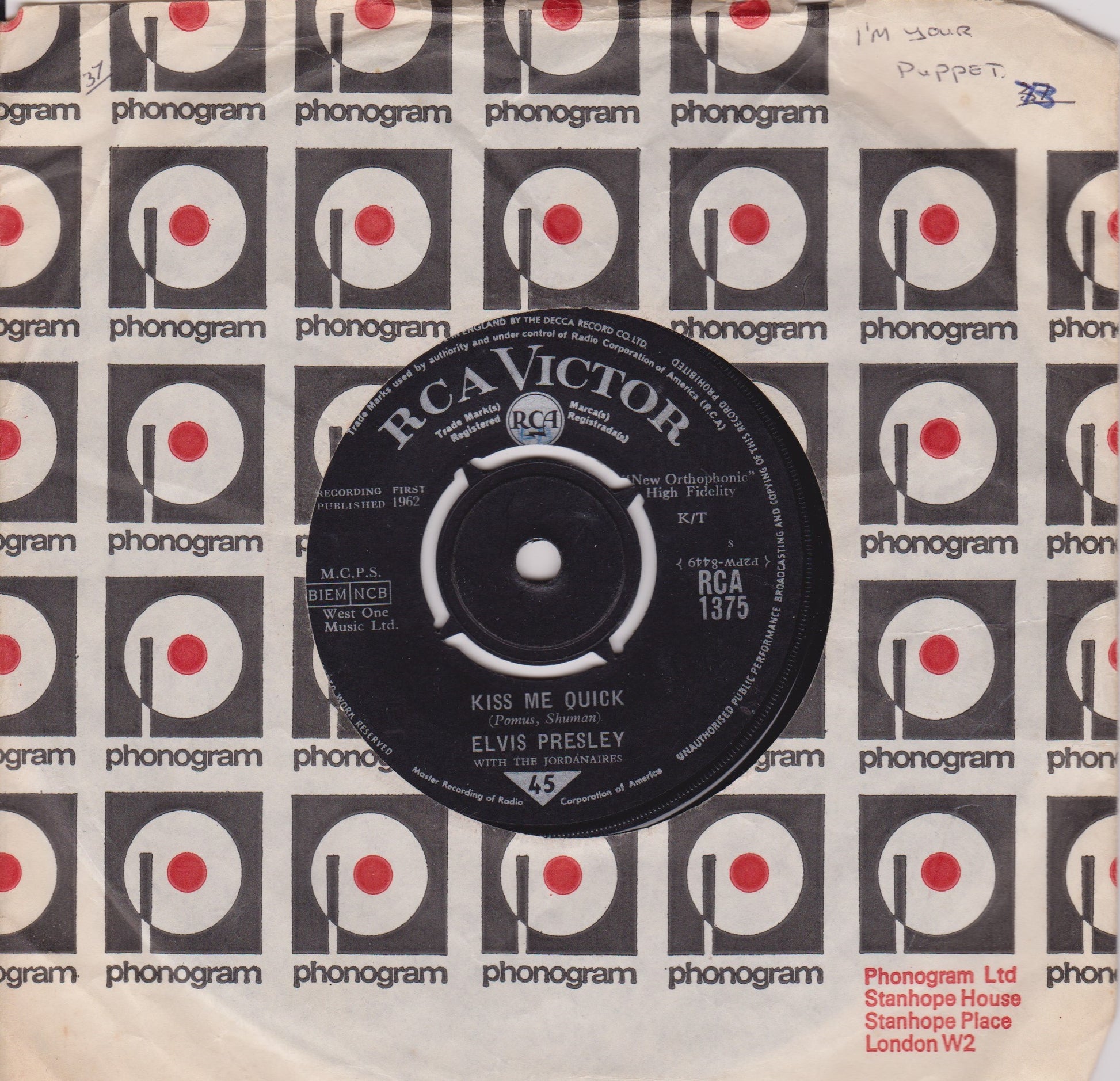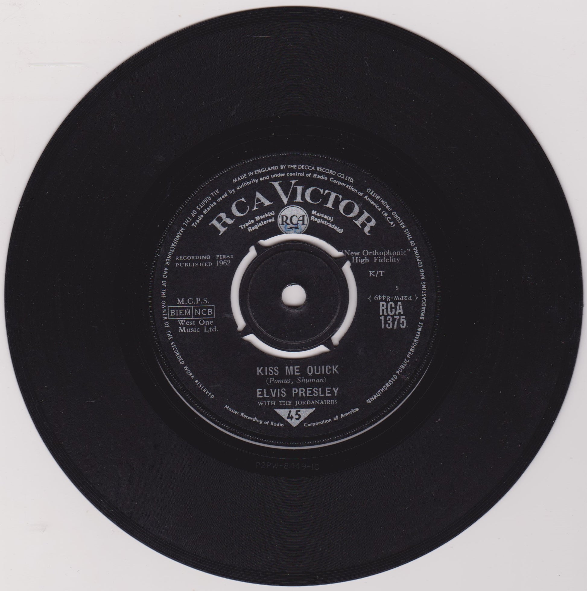 Elvis Presley With The Jordanaires – Kiss Me Quick (RCA 1963) 7" vinyl single G+/-