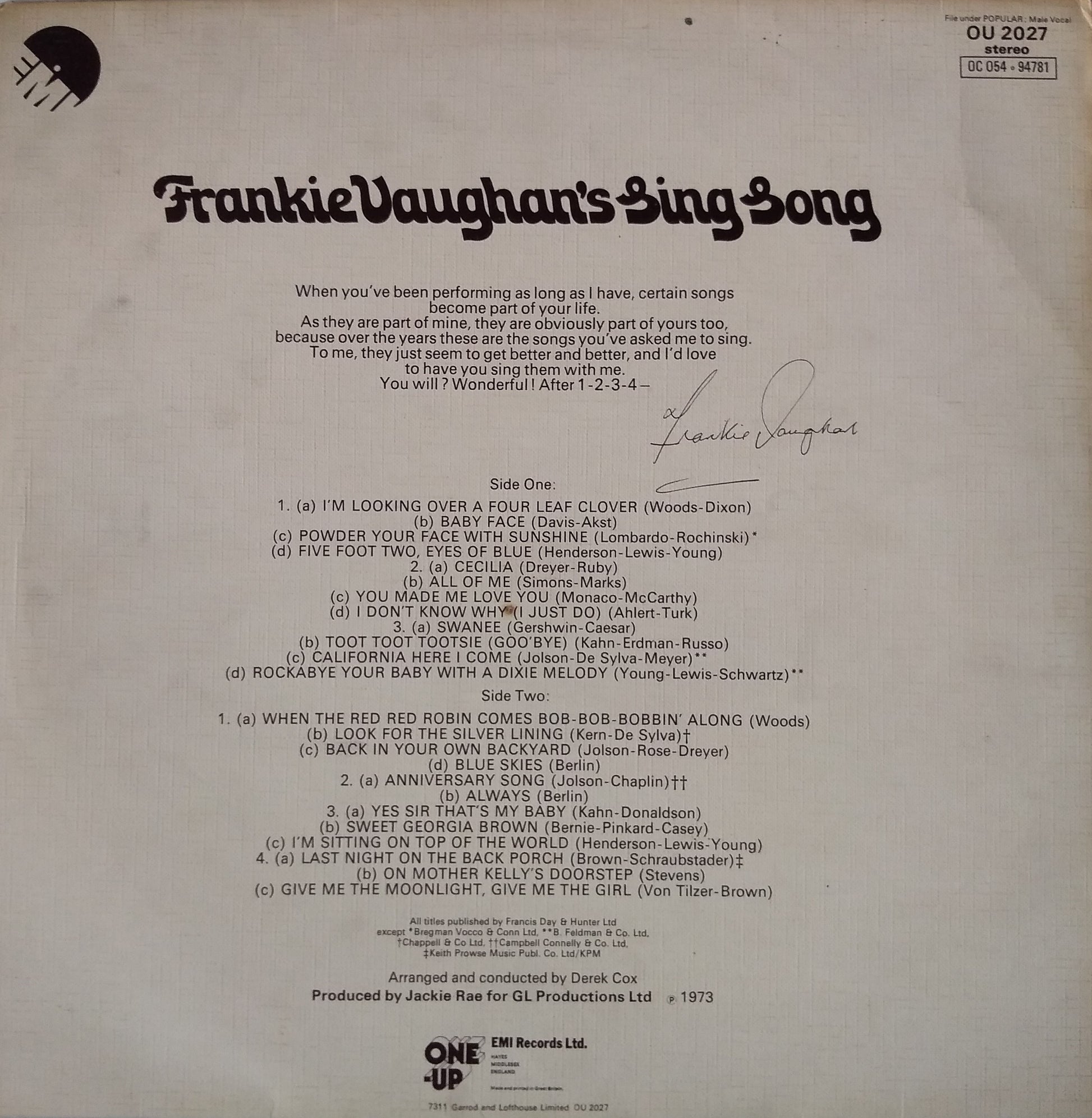Frankie Vaughan – Frankie Vaughan's Sing Song (One-Up 1973) 12" vinyl LP VG/VG