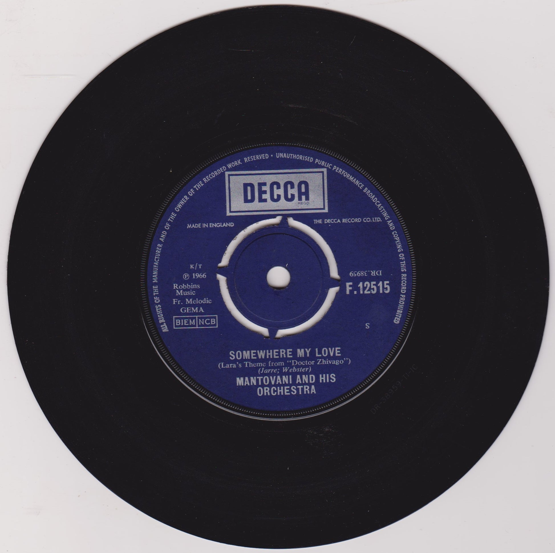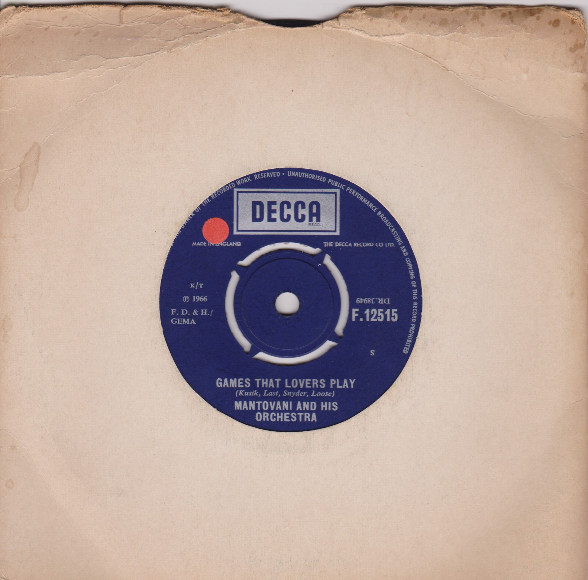 Mantovani And His Orchestra – Games That Lovers Play (Decca 1966) 7" vinyl single VG/-