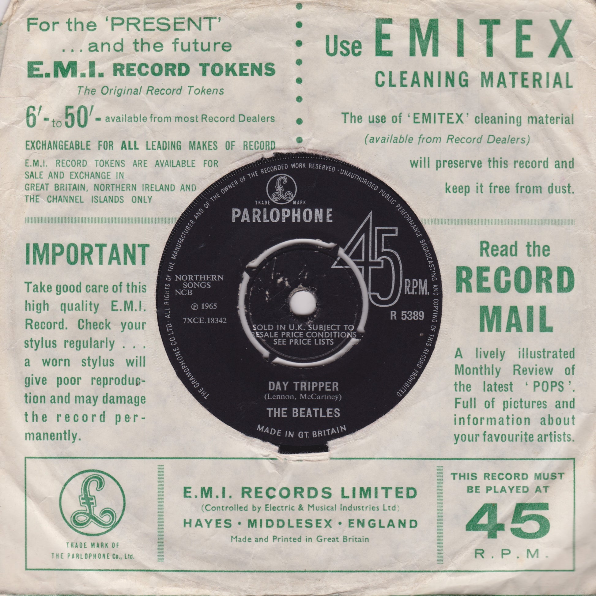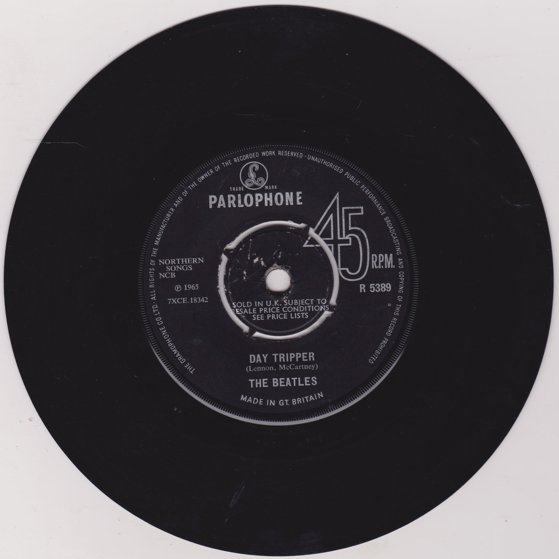 Parlophone company sleeve (not original) has some signs of ageing - edge tears, some creases and scuffs. The disc is play tested and in very good used condition - surface noise is evident, especially in soft passages and during a song's intro and fade, but does not overpower the music otherwise. Light groove wear is noticeable, as are light audible scratches. Surface scratches on the Daytripper label.
